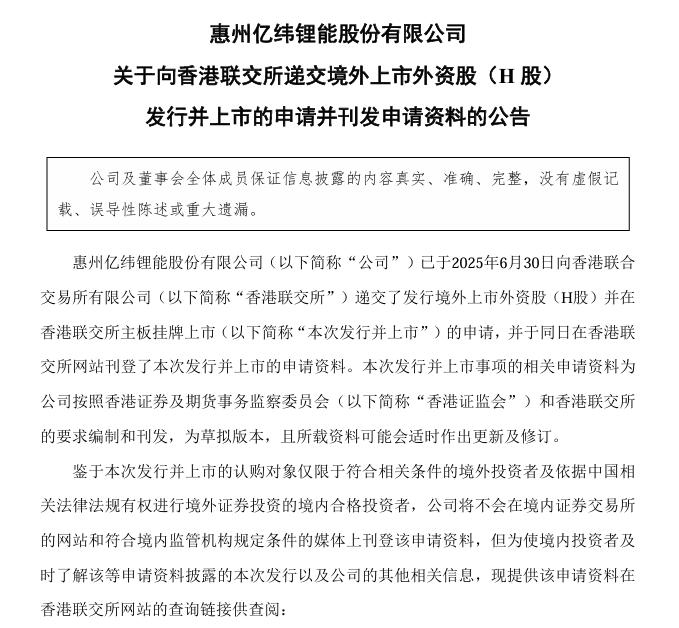 2025年06月30日,惠州亿纬锂能股份有限公司发布《关于向香港联交所递交境外上市外资股(H 股)发行并上市的申请并刊发申请资料的公告》。